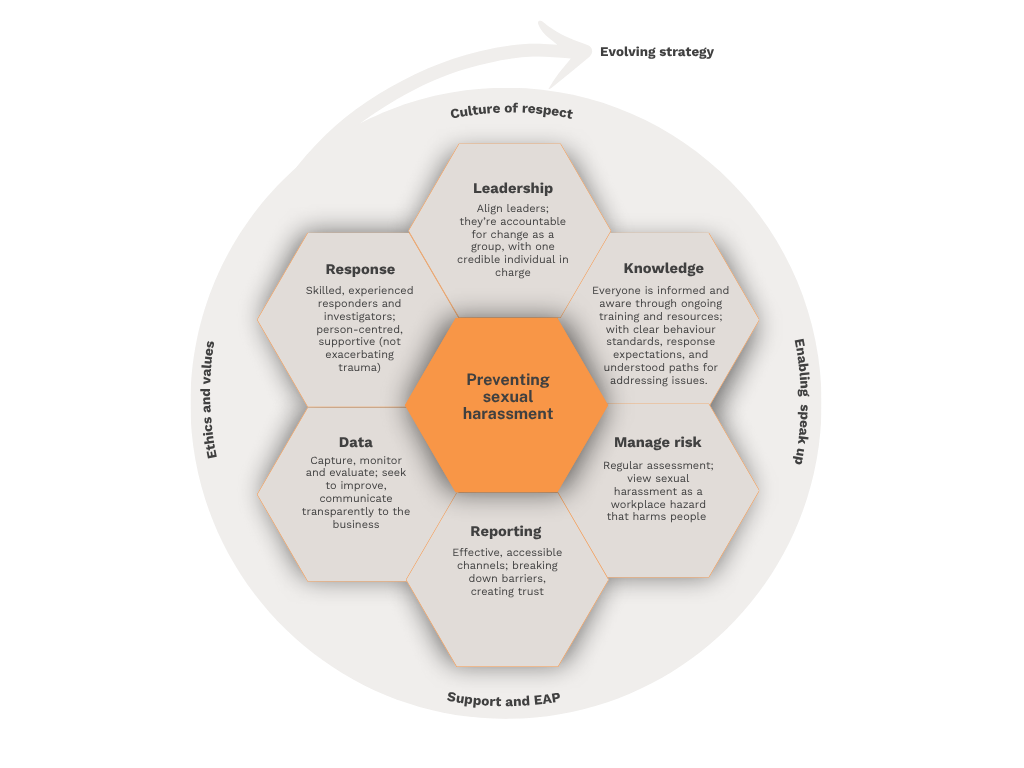 Training is vital, but preventing harassment ultimately takes more. It needs leadership, effective reporting, skilled responses, good data, ongoing knowledge, and active risk management — all underpinned by strategy, values and a culture of respect. The diagram below shows the holistic approach needed.